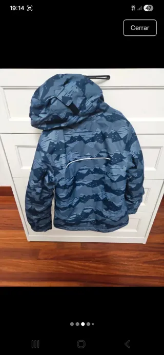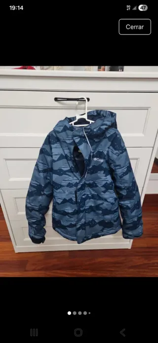 Chaqueta y peto de nieve para niño de la marca Columbia. - Diseño con estampado de montañas y camuflaje. - Color azul y gris.