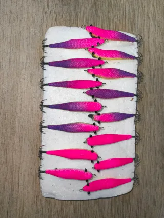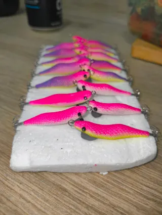 Conjunto de señuelos de pesca hechos a mano. - Diseño de pez. - Colores personalizados - Plomados perfectos - Distinto peso de plomado Señuelos artesanos para pescar de calamar eging, tallados a mano, también hago colores que te gusten. Son 10€ la unidad, en caso de coger más se harán ofertas