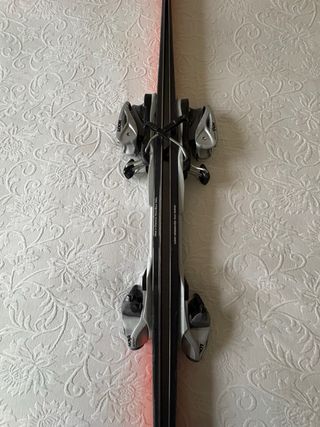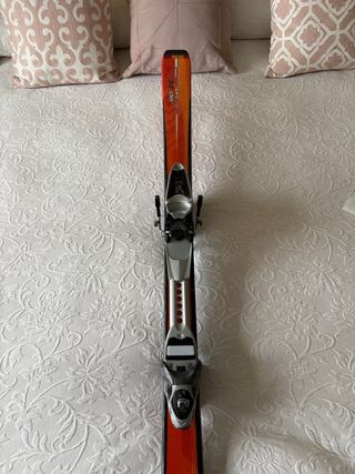 Esquís con fijaciones incluidas, listos para la nieve. - Diseño deportivo en naranja y negro. - Fijaciones metálicas plateadas y negras. Se incluye palos y botas aparte(110€)