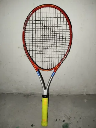 Raqueta de tenis Dunlop con un diseño llamativo. - Marco de color rojo y detalles plateados. - Empuñadura amarilla. - Cuerdas negras.