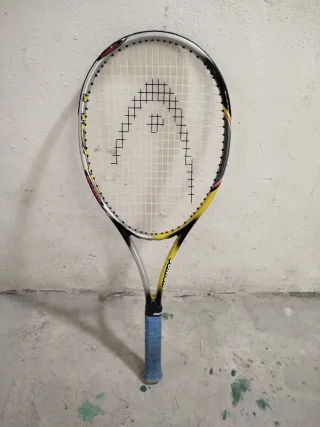 Raqueta de tenis Head Radical Oversize. - Marco plateado con detalles en amarillo y negro. - Logo de Head en la red. - Empuñadura azul.