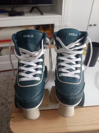 Se venden patines de la marca Oxelo en color verde azulado. - Diseño de bota alta. - Cordones blancos. - Ruedas de color beige.