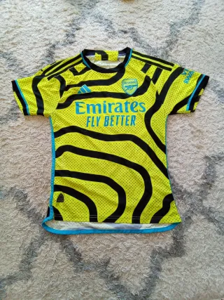 Camiseta de fútbol del Arsenal de la temporada 2023/2024. - Diseño llamativo en amarillo y negro. - Logo de Adidas y escudo del Arsenal. - Patrocinador Emirates Fly Better.