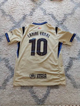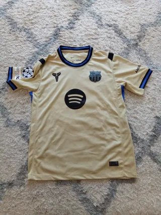 Camiseta del FC Barcelona. - Color dorado. - Cuello redondo con ribete azul. - Logo de Nike en negro. - Escudo del FC Barcelona. - Logo de Spotify en negro. - Parche de LaLiga en la manga izquierda. - Detalle AMBIL en la manga derecha.