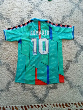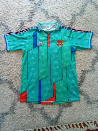 Camiseta de fútbol vintage del FC Barcelona, talla M. Diseño retro con los colores icónicos del club y el logo de Kappa. - Color principal verde agua. - Detalles en azul y rojo. - Logo de Kappa en mangas y pecho. - Escudo del FC Barcelona bordado.