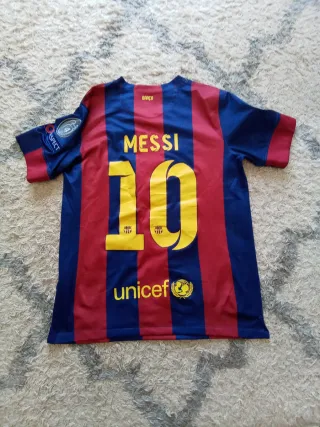 Camiseta de fútbol del FC Barcelona, talla M, de la temporada 2014-2015. Conmemorativa de la final de Berlín. - Diseño a rayas rojas y azules. - Logo de Nike y escudo del club. - Inscripción de la final de la Champions League 2015. - Parche de la Champions League y trofeo. - Patrocinador Qatar Airways.