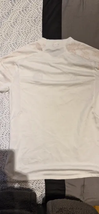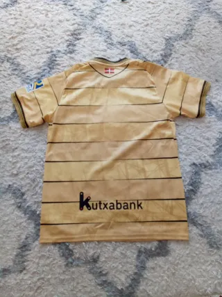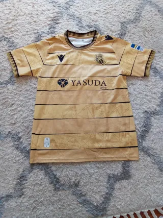 Camiseta de la Real Sociedad en talla L, con un llamativo diseño en color dorado. - Diseño con líneas horizontales negras. - Escudo del club en el pecho. - Logo de Yasuda Group. - Detalle de Macron en el hombro.