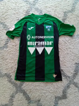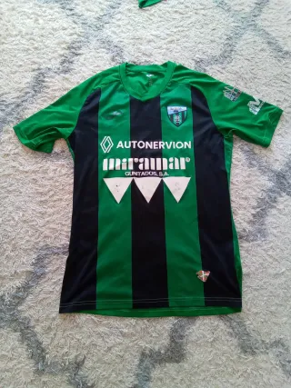 Camiseta de fútbol del Sestao River Club de Fútbol. - Talla L. - Diseño a rayas verdes y negras. - Logo del club en el pecho. - Patrocinadores visibles en la parte frontal.