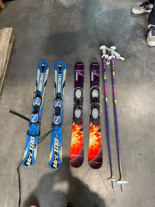 Conjunto de esquís para niños, ideal para iniciarse en el deporte. - Dos pares de esquís Quechua (Mrz 100) en azul. - Dos pares de esquís Fischer en morado con diseño de fuego. - Dos pares de bastones de esquí.