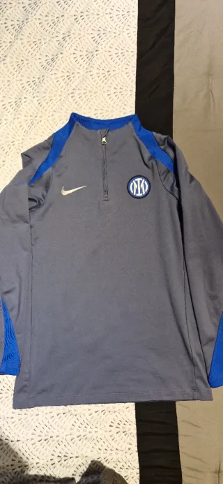 Sudadera de entrenamiento Nike Inter Milan. - Talla L niño 147-158cm - Diseño Dri-Fit Strike. - Cremallera parcial en el cuello. - Logo de Nike y escudo del Inter. - Mangas con detalles en azul.