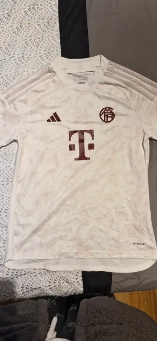 Camiseta del FC Bayern Munich con un diseño floral sutil. - Talla 13-14 años 164cm - Color blanco roto con estampado floral en tonos rosados. - Logo de Adidas y escudo del club en color burdeos. - Sponsor T en el frontal. - Tecnología Aeroready.