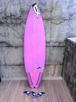 Tabla de surf de color rosa vibrante, lista para tus próximas olas. - Diseño llamativo en color rosa. - CX. - Detalle de rayas en la cola. - Marca JH Shapes visible. Medidas - 5’6 - 17 7/8 - 2 1/8 - 21,71L Con quillas son 250€ Solo venta en persona🚨