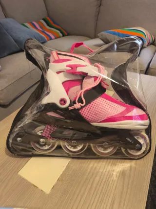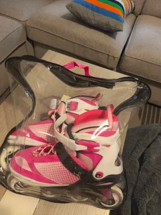Patines en línea Crivit para niña, ajustables en talla del 37- 41 Como nuevos usados 2 horas . - Color rosa y blanco. - Cierre de velcro y hebilla. - Ruedas ABEC-7.