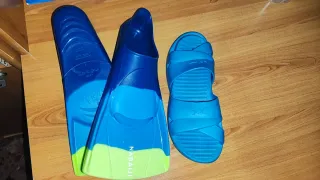 Conjunto de aletas de natación y chanclas en color azul y verde lima. - Aletas de natación marca Nabaiji talla 33-34 - Chanclas de color azul talla 37-38