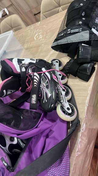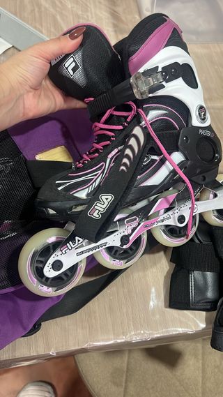 Patines en línea Fila. Con coderas,rodilleras y muñequeras. - Diseño en negro, blanco y rosa. - Cierre de hebilla y cordones. - Ruedas Fila de 84mm.