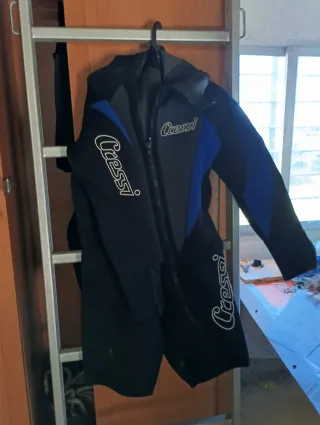 Traje de buceo Cressi de color negro y azul. Diseñado para ser polivalente. - Cierre frontal con cremallera. - Logo de Cressi en la parte delantera y en la manga. - Cuello alto.Interior de toalla.7 mm.Para Invierno y verano...nuevo a estrenar..2 piezas...