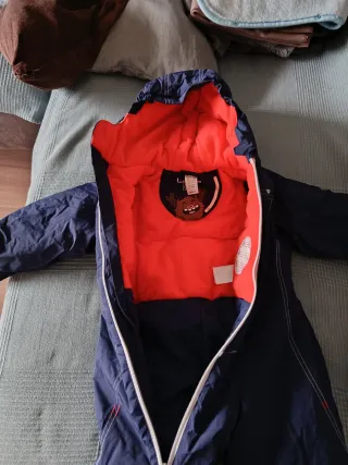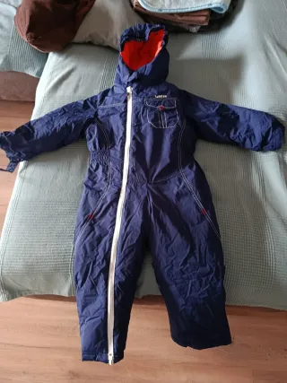 Mono de nieve de la marca Wed'ze, ideal para los días de frío y nieve. Es un mono de una pieza muy práctico. - Talla 98/104. - Color azul marino con detalles en naranja afelpado en el interior de la capucha. - Cierre frontal con cremallera blanca. - Bolsillos en el pecho con solapa y botón. - Cintura elástica para un mejor ajuste.