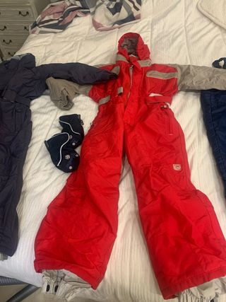 Conjunto de ropa de invierno para niños, ideal para la nieve. Incluye mono y pantalón con tirantes. - Mono de esquí rojo con detalles grises. - Pantalón de nieve azul marino con tirantes ajustables. - Guantes a juego en color beige.talla 6 años (el precio es individual por mono)