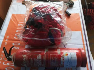 Se vende extintor de 3 kg para nautica.Revisado, achicador, botiquín y ancla de capa, para mRcas hasta 5 metros. - Extintor de color rojo. - Bolsa con material náutico.