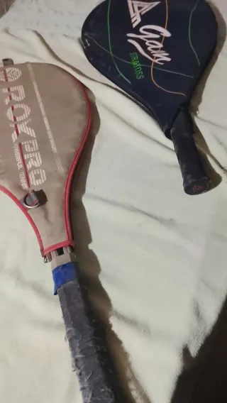 Dos raquetas de tenis, una marca Pro y otra Stratoss. - Raqueta Pro con funda. - Raqueta Stratoss de color azul.