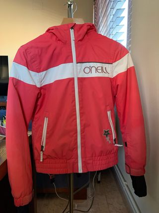 Chaqueta de esquí para niña de la marca O'Neill. Talla 10-12 años - Color rosa con detalles blancos y logo. - 5 Bolsillos: 2 interiores, 2 exteriores y 1 en el brazo para el firfait. - Puños en las mangas para mantener las manos calientes - Capucha