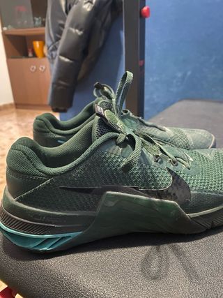 Zapatillas Nike Metcon diseñadas para entrenamiento de fuerza. - Color verde oscuro. - Diseño deportivo y funcional. - Logo de Nike en el lateral. - Talla 40 Me han regalado unas barefoot y llevo más de medio año sin usarlas.