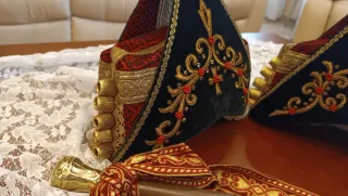 Conjunto de dos monteras y dos bastones de mando. Piezas decorativas con detalles dorados y rojos. - Monteras cónicas con adornos. - Bastones de madera con cintas. - Base de encaje blanco.