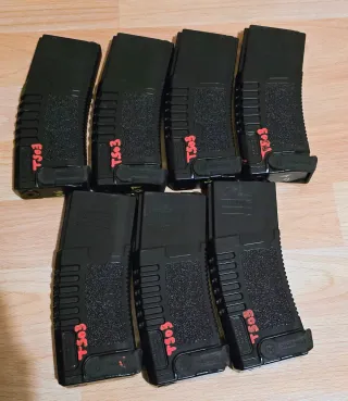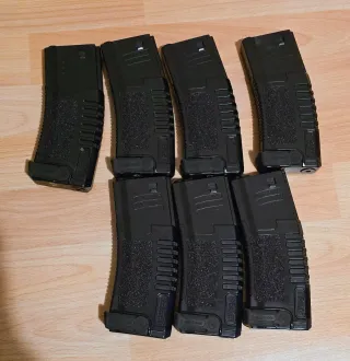 Set de 7 cargadores para réplicas de airsoft M4, de la marca Ares Amoeba. Capacidad de 120 bolas por cargador. - Modelo Mid-Cap. - Compatibles con réplicas Ares Amoeba.