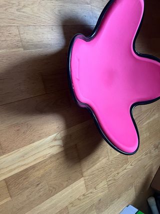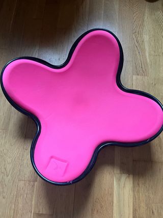 Cojín de ejercicio de color rosa con un diseño divertido en forma de flor. Ideal para rutinas de gimnasia y abdominales. - Color: Rosa vibrante. - Diseño: Forma de flor con borde negro. - Material: Superficie acolchada.