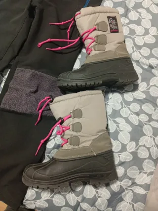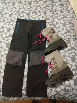 Conjunto de pantalón y botas de nieve para niño. - Pantalón de color negro con detalles grises y cremalleras azules. - Botas de nieve de color gris y marrón con cordones rosas.
