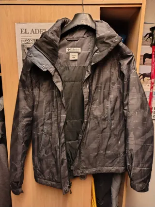 Chaqueta Columbia con diseño a cuadros, ideal para la nieve. - Color gris oscuro con líneas blancas. - Cuello alto con capucha. - Cierre de cremallera frontal. - Bolsillos laterales.