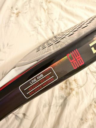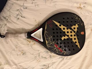 Pala de pádel de la marca Drop Shot. - Diseño en color negro con detalles dorados y rojos. - Superficie con agujeros. - Empuñadura con grip blanco.