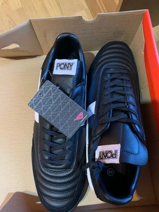Botas de fútbol para césped artificial o tierra con suela multitacos. - Color negro con detalles blancos. - Marca Pony. - Cierre de cordones. - Nuevas a estrenar con etiqueta.