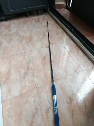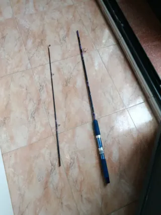 Caña de pescar de dos tramos con una longitud de 1.80 metros. A sido arreglada de la punta como se ve en las fotos de soltó la anilla y fue pegada - Diseño en color azul y morado. - Empuñadura de goma azul.