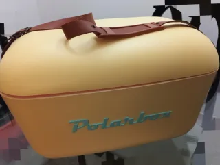 Nevera portátil Polarbox de estilo retro con una capacidad de 20 litros. Preciosa. SIN ESTRENAR. Interior de poliestireno expandido de alta densidad, mantiene el frío durante horas y horas, incluso bajo el sol. Ligera, resistente y muy cómoda de llevar. Asa de piel ajustable. Medidas: 44,7 × 30,2 × 28,9 mm. Envío rápido. - Color: Amarillo pastel, interior rosa empolvado. - Material: Poliestireno - Correa: Cuero