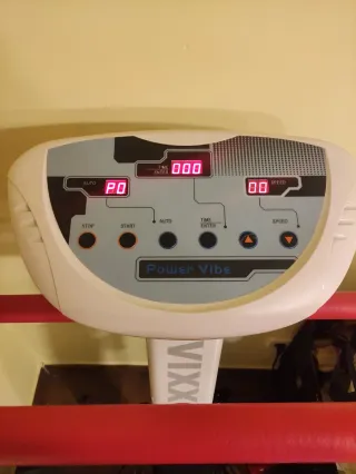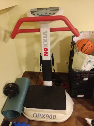 Plataforma vibratoria VIXXON modelo OPX900. - Diseño moderno con asas rojas. - Superficie de entrenamiento negra. - Incluye bandas elásticas para ejercicios.