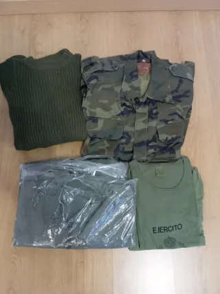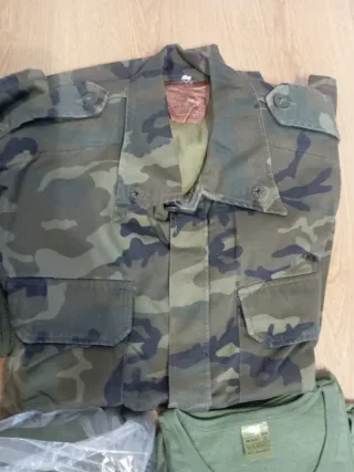Conjunto de ropa militar de camuflaje. - Chaqueta de camuflaje con múltiples bolsillos. Talla 3L - Jersey de lana verde. Talla 54 - Pantalón de camuflaje. Talla 3L - 2 Camiseta verde talla G - Mono de trabajo talla 2, equivale L amplia.