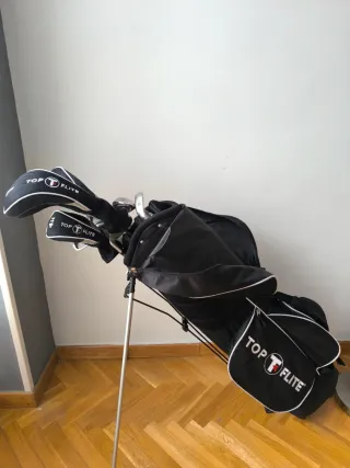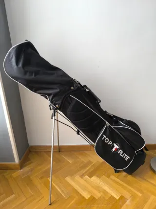 Bolsa de golf negra con trípode integrado de la marca Top Flite en muy buen estado. -Incluye 11 palos (ver fotos) -Caja con 12 bolas (ver fotos) - Diseño ligero y funcional. - Múltiples compartimentos para palos y accesorios. - Patas de trípode para mayor estabilidad.