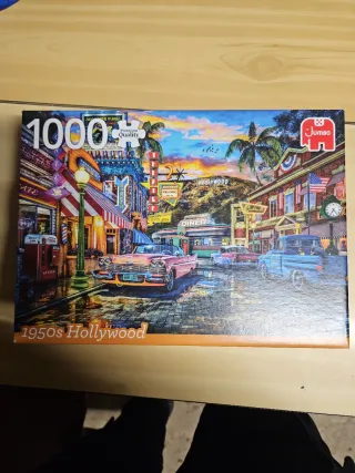 Puzzle de 1000 piezas con una escena vibrante de Hollywood en los años 50. Ideal para los amantes de los coches clásicos y la nostalgia. - Ilustración detallada de una calle de Hollywood. - Incluye coches clásicos de los años 50. - Paisaje con palmeras y atardecer. - Marca: Jumbo.