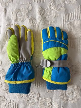 Conjunto de guantes de nieve para niños, perfectos para mantener las manos calientes y secas. - Diseño multicolor en azul, verde lima y amarillo. - Puño elástico con ajuste de velcro. - Materiales resistentes para actividades al aire libre. Mas o menos de 6 a 8 años, no pone talla