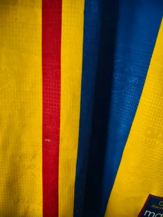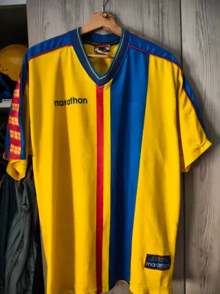 Camiseta de la selección de Ecuador de la marca Marathon. - Diseño con franjas verticales rojas y azules. - Logo de Marathon en el pecho. - Detalle de franjas en las mangas.