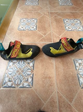 Pies de gato de escalada en muy buen estado, prácticamente sin usar. Se venden por talla incorrecta. - Cierre con velcro. - Suela de goma adherente. - Diseño ergonómico.