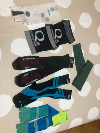 Conjunto de prendas de compresión para running. - Perneras de compresión negras Compresport , talla 2 usadas. - Pantorrilleras de compresión Salomon blancas tecnologia NSO, talla 3, usadas. - Pantorrilleras de compresión verdes 2XU nuevas - Medias de compresión negros y burdeos RUN ENERGIZER X-socks 42-44, nuevos - Medias de compresión negros y azules RESET SPORT, tecnologia Kinesotaping para prevenir la periostitis, talla 42-44, nuevas - Calcetines de dedos OS20 en verde y azul, nuevos. El lote se vende completo, no se despieza.