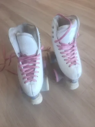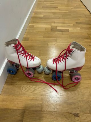 Se venden patines de competición de cuatro ruedas en color blanco. - Cordones rojos. - Ruedas de colores (rosa y azul). - Marca en las ruedas: 'ROMPLESS'.