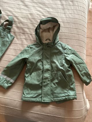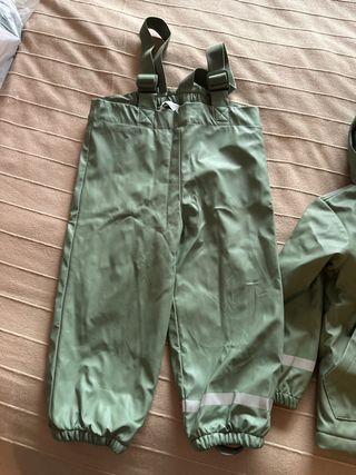 Conjunto de chaqueta y pantalón impermeable para niños en color verde. - Tirantes ajustables en el pantalón. - Puños elásticos en pantalón y chaqueta. - Bandas reflectantes en los bajos del pantalón y mangas. - Talla 2-3 años