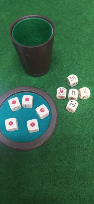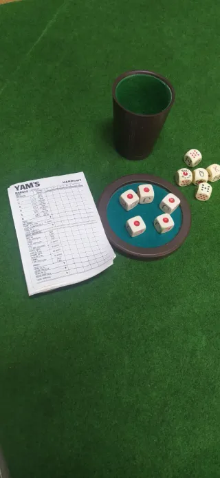 Juego de dados de poker. YAM'S HARMONY. Ya tiene bastantes años, pero aún se le puede dar juego. Se regala otro juego de dados. Con hojas de puntuación YAM'S HARMONY. Se vende tal cual se ve en las fotos. Para cualquier duda o consulta preguntad sin problemas.