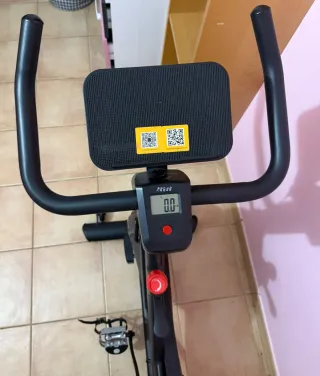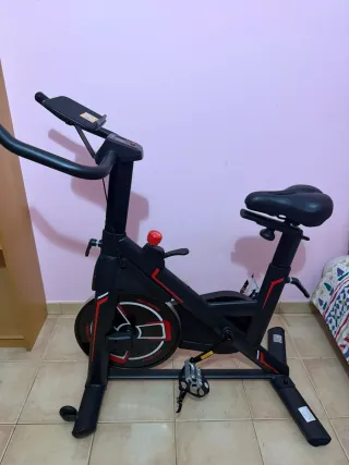 Bicicleta estática de diseño moderno en color negro con detalles en rojo. Perfecta para entrenamientos en casa. - Manillar ajustable. - Sillín cómodo y regulable. - Pedales con agarre. - Pantalla digital.