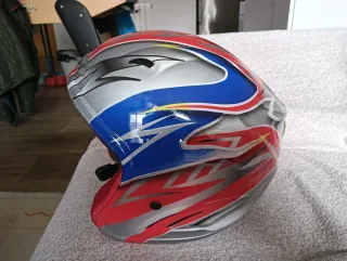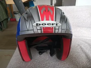 Casco de esquí Boeri con un diseño llamativo en colores rojo, azul y plateado. - Diseño con detalles gráficos. - Marca Boeri visible en el frontal.