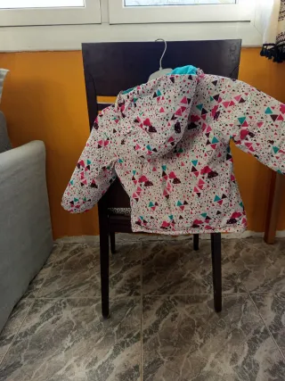 Chaqueta de nieve para niños con un divertido estampado de triángulos y nubes en tonos rosas, turquesas y morados sobre fondo blanco. El interior es de color turquesa. - Diseño con capucha. - Cierre de cremallera frontal. - Talla 2 años