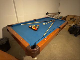 Mesa de billar en perfecto estado, lista para disfrutar. medidas 2,06x 1,13 metros. - Estructura de madera. - Incluye juego de bolas, tres palos de billar, triangulo y caja nueva de tacos de tiza